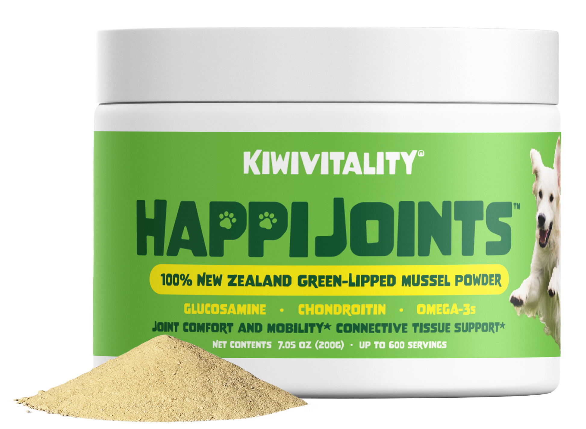 - Advanced Dog Hip & Joint Care Formula. Experience the Benefits of Green-Lipped Mussels, a natural source of 18 Omega-3 Fatty Acids, Glucosamine, and Chondroitin with HappiJoints: Providing essential daily support for your dog's hip and joint health. This effective and safe unique protein source helps alleviate arthritis symptoms and contributes to the maintenance of healthy joints, muscles, and agility.